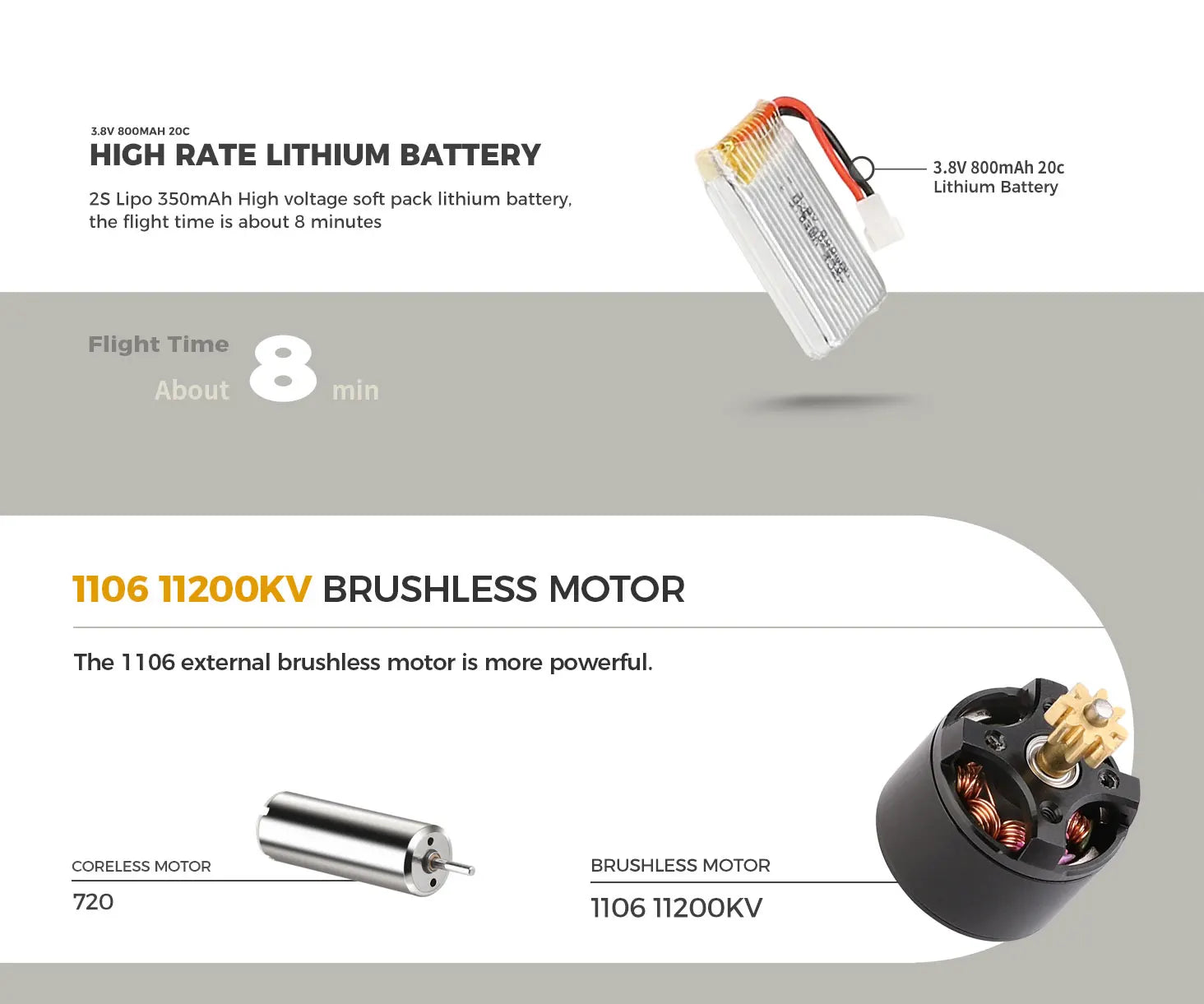 Equipped with a high-efficiency 1106 brushless main motor and 720 hollow cup tail motor. Paired with a high-voltage 3.7V 800mAh battery for up to 8 minutes of powerful flight.